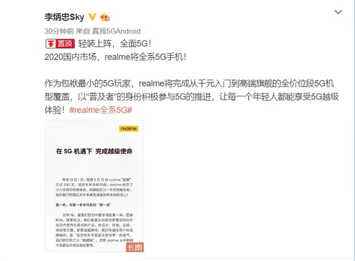 刚刚,realme CEO@李炳忠Sky 宣布,2020国内市场,realme将全系5G手机。他表示,作为包袱最小的5G玩家,realme将完成从千元入门到高端旗舰的全价位段5G机型覆盖,以“普及者”的身份积极参与5G的推进,让每一个年轻人都能享受5G越级体验。