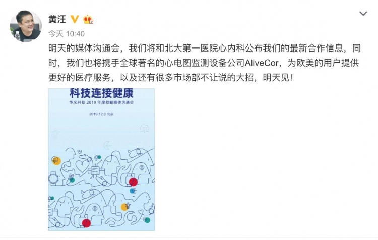 2019年12月2日,华米科技创始人、董事长兼CEO黄汪通过微博宣布,华米科技(NYSE:HMI)将于12月3日在北京举行主题为“科技连接健康”的年度战略媒体沟通会。届时,华米科技将会公布与北大第一医院内科的最新合作信息以及与全球著名的心电图监测设备公司AliveCor达成合作,为欧美的用户提供更好的医疗服务,进一步完善其在健康领域内的布局。