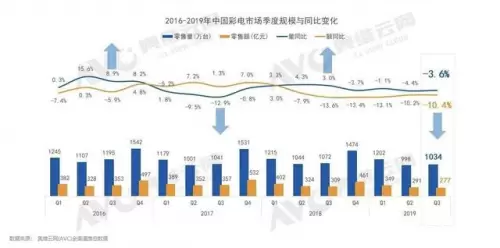 根据奥维云网(AVC)公布的数据:2019年Q3中国电视市场零售量1034万台,同比下跌3.6%;零售额277亿元,同比下跌10.4%。自2018年Q4以来,连续四个季度下滑,电视市场进入"低迷惯性周期"。