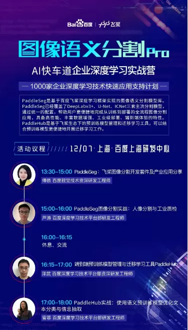 看到这里,您是不是也想去百度AI快车道一探究竟?百度AI快车道在12月7日将走进上海,在百度上海研发中心,讲师们为大家准备了同样的PaddleSeg+PaddleHub课程,报名的方式很简单,关注微信公众号“飞桨PaddlePaddle”,回复“AI快车道”,即可获取报名链接。