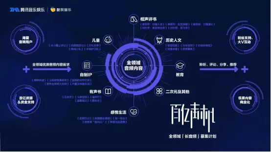对此,腾讯音乐娱乐集团分别在播客、有声书等长音频领域发力。近日,集团旗下酷我音乐也推出了“百亿声机”计划,提出了“全领域音频内容”布局,形成了覆盖多品类、多兴趣圈、多年龄层的长音频生态。据悉,“百亿声机”计划目前囊括两性情感、有声书、历史人文、曲艺相声、儿童、教育、二次元、自制内容等,用户不仅可以在酷我音乐平台一次性收听到喜爱的各类主播“新声”,还可以收听到大热的《庆余年》《斗破苍穹》《鬼吹灯》《甄嬛传》等有声书,找到歌曲、故事、古玩、相声等兴趣“同好”。