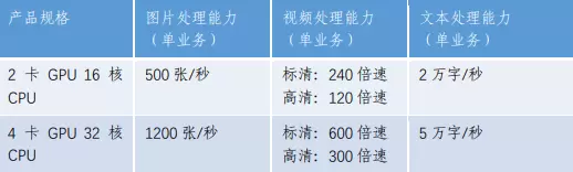 目前,审核一体机提供2卡 GPU 16核 CPU以及4卡 GPU 32核 CPU两种产品规格产品供选用,后者可为客户提供1200张/秒,5万字/秒文本处理、标清600倍速、高清300倍速的视频内容处理能力,极大保证内容审核的效率。