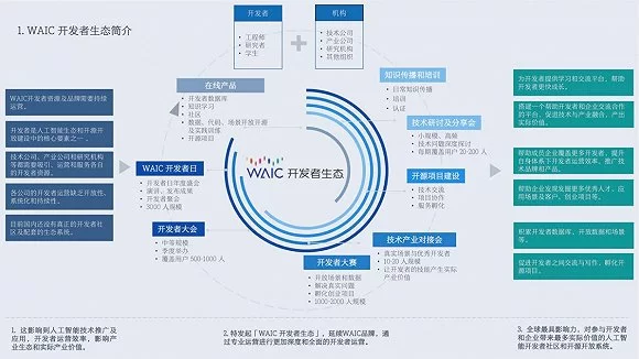 开幕式上,“WAIC开发者生态”项目由华为、阿里云、百度、腾讯云、微软亚洲研究院、科大讯飞、小米等15家人工智能企业共同启动。该项目意在为参与“WAIC世界人工智能大会”的开发者搭建平台,提供知识输出、技术交流、产业合作等服务。