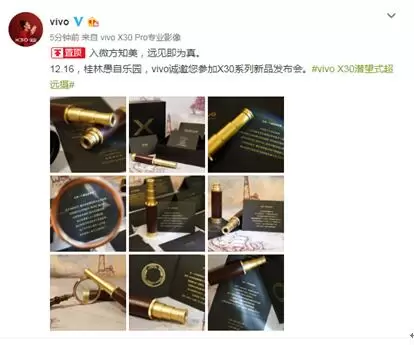 望远镜作为一个奇妙的物件,它用高倍的视角拓宽了人类的视界,帮助我们洞察到世间的美好。而vivo X30系列发布会选择用可伸缩的单筒望远镜作为邀请函,其镜身上印刻着“发现更多美”字样,也延续了过往X系列的调性。