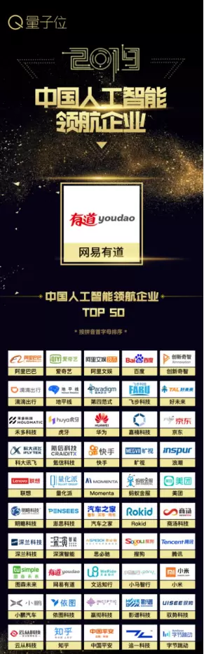 近日,量子位2019中国人工智能年度评选揭晓,网易有道入选“2019中国人工智能领航企业TOP50”,一同入选榜单的还有阿里巴巴、腾讯、旷视等在人工智能领域表现亮眼的公司。