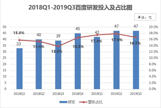 连续两年占据专利申请榜榜首的背后,是百度CEO李彦宏对人工智能发展的战略布局与支持。百度公布的2019年第三季度财报显示,百度第三季度研发投入达47亿元人民币,占营收比重16.7%。李彦宏曾公开表示,百度专注于自己擅长的技术创新,从八、九年前就开始大规模投入人工智能技术的研发,这几年研发投入占总收入的15%左右。