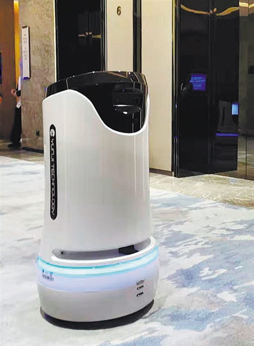 云迹科技公司的服务机器人“润”(Runner)正在等电梯,这款机器人可以用于酒店客服。