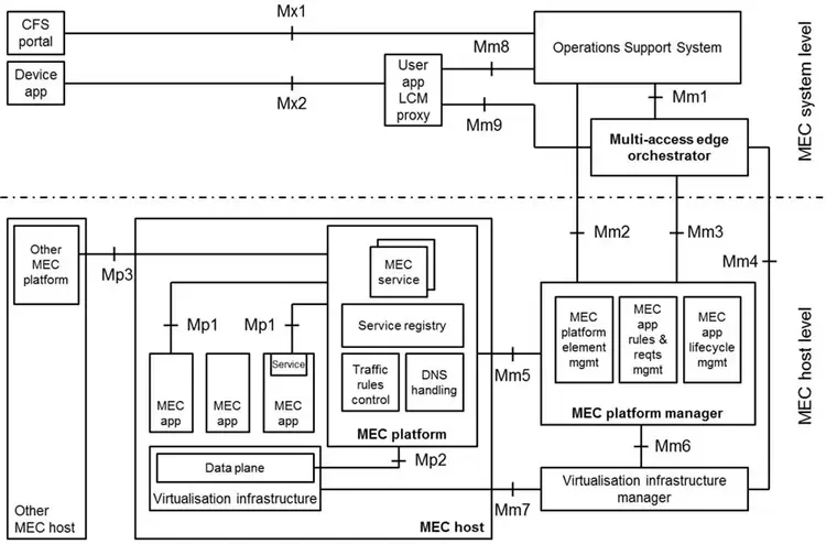 在Host level,MEC 主机为App运行提供VIM管理的虚拟化基础设施。MEC platform让App可以发现、通知、消费其中的边缘服务,注册第三方服务,以及基于分流策略和DNS配置控制Data Plane规则。MEC platform manager则负责App生命周期管理、性能统计、服务授权、以及分流策略与DNS配置等应用规则管理,并负责MEC platform基本运维管理。