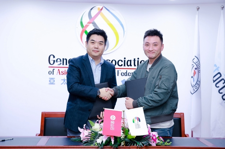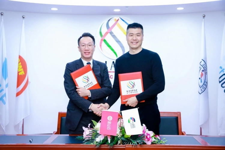 金山云合伙人、高级副总裁梁守星(图左一)与亚太体育联合会总会会电子竞技委员会秘书长曲正超(图右一)战略合作签约