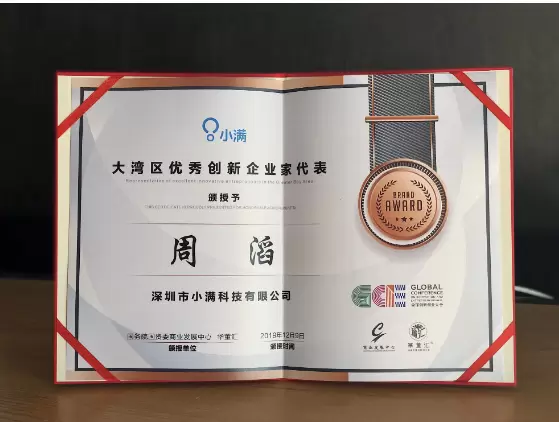 周滔获得的“大湾区优秀创新企业家代表”荣誉证书