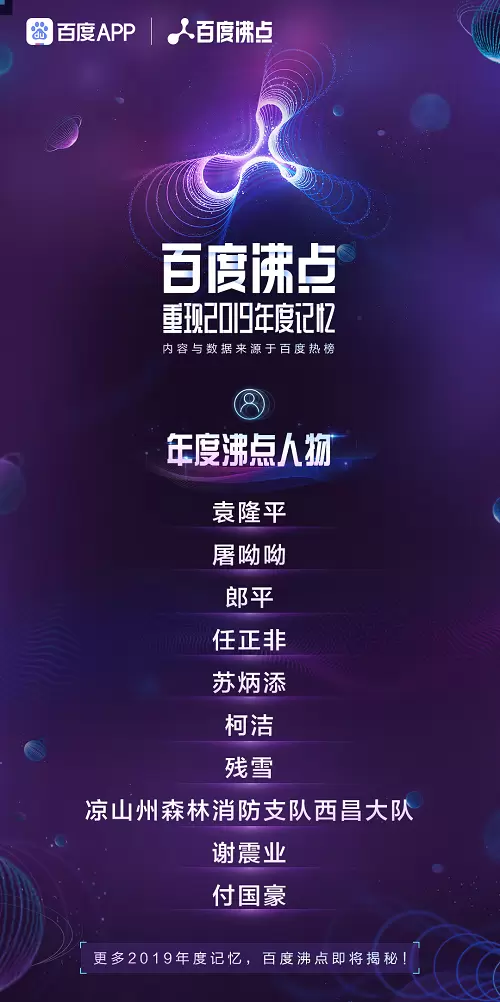 百度沸点正是基于这些用户行为分析而得,被认为是忠实呈现网民关注的大数据权威榜单。此次发布的“百度沸点2019年度人物”是沸点系列榜单之一,反映出广大网民心中2019年最值得关注的人物,他们象征着时代精神和时代浪潮的方向。