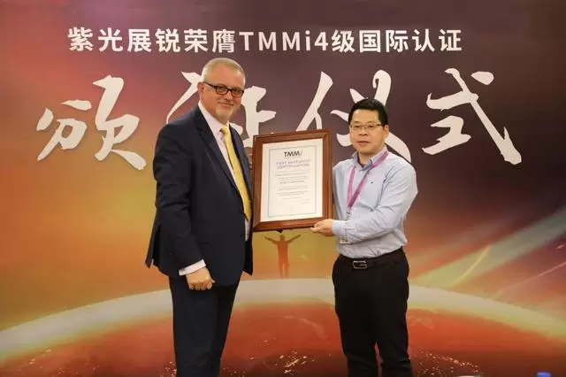12月11日,TMMi基金会主席Geoff Thompson亲临上海为紫光展锐颁发了TMMi4级认证证书。这标志着紫光展锐成为了全球手机芯片设计领域首家通过TMMi4级认证的企业。