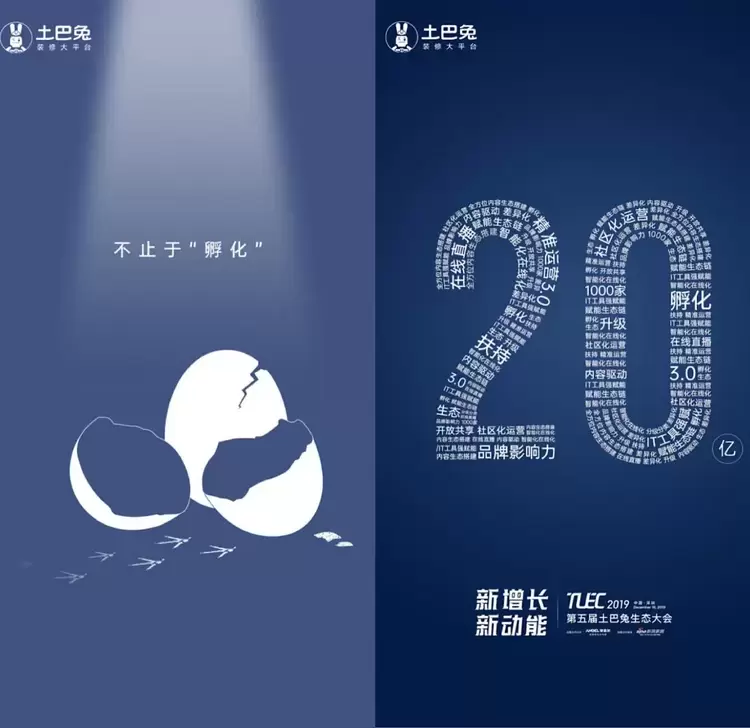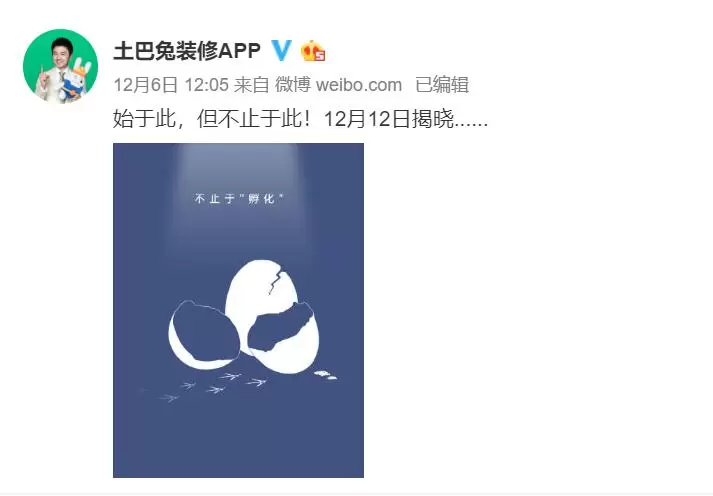 一周前的12月6日,在事先没有任何预兆的情况下,土巴兔官方微博对外发布海报:一颗破碎的蛋与一颗即将破碎的蛋倚靠一起,旁边留着伸向远方的脚印,画面中央是“不止于‘孵化’”五个大字。