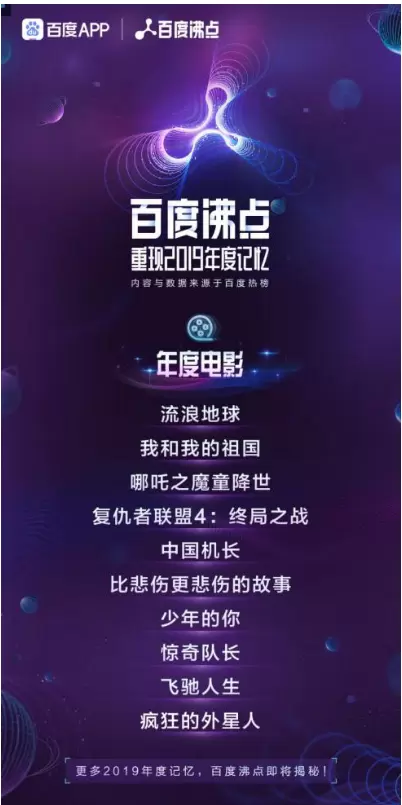 12月13日,继科技榜、流行语榜、人物榜和电视榜后,百度沸点又发布了2019年度电影榜:《流浪地球》、《我和我的祖国》、《哪吒之魔童降世》、《复仇者联盟4:终局之战》、《中国机长》、《比悲伤更悲伤的故事》、《少年的你》、《惊奇队长》、《飞驰人生》、《疯狂地外星人》十部电影成为2019年最受中国网民关注的影片。