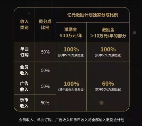 这便是“亿元激励计划”的价值所在,既帮音乐人更好的推广,也帮他们获得更高的收入:根据“亿元激励计划”的活动说明,独家签约腾讯音乐的音乐人,分成比例将从通常的50%,提高到100%,而且,还可以享受到更多的曝光机会和推广资源。