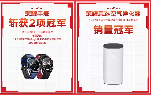在12月12日当天,荣耀手表和荣耀亲选空气净化器也斩获了亮眼的冠军佳绩。