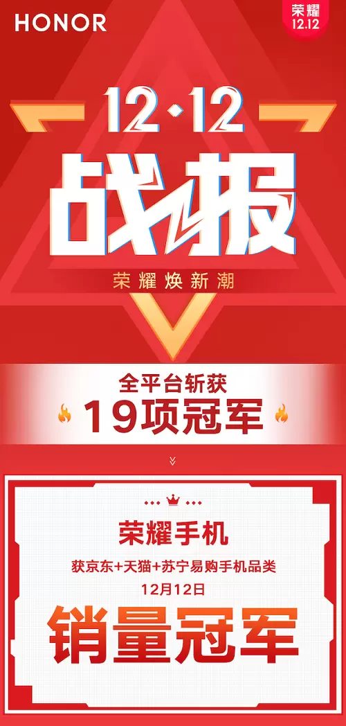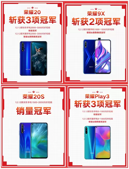 在今年的双12战场中,荣耀其他款热销机型也取得了相当亮眼的战绩。在12月12日当天,荣耀20斩获京东手机2000-3000元价位段销量冠军及天猫手机2000-3000元价位段销量和销售额双冠军共计3项重磅佳绩;荣耀9X斩获天猫手机1000-1500元价位段销量和销售额双冠军;荣耀20 S获得京东手机1500-2000元价位段销量冠军。荣耀Play3获得京东0-1000元价位段销量冠军,天猫手机0-1000元价位段销量和销售额双冠军。