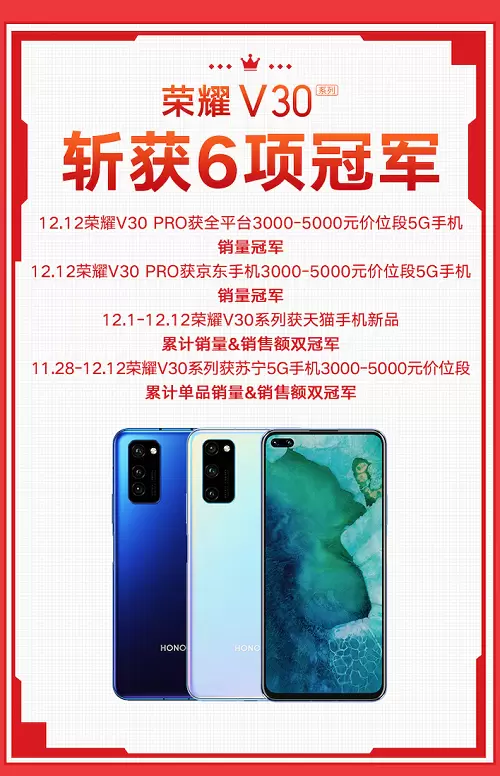 荣耀V30 PRO开售火爆斩获多平台销量冠军 荣耀双12焕新潮圆满收官