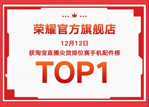 另外,在12月12日,荣耀官方旗舰店还斩获淘宝直播尖货排位赛手机配件榜TOP1佳绩。