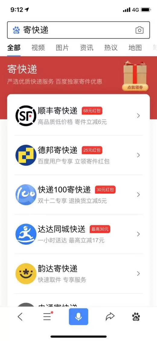 今年双11期间,不少用户选择在百度App上直接下单寄快递。近日,为满足“双十二”前后用户激增的寄货退货需求,百度App又联合顺丰、德邦等物流企业,推出了“寄快递”专项活动。
