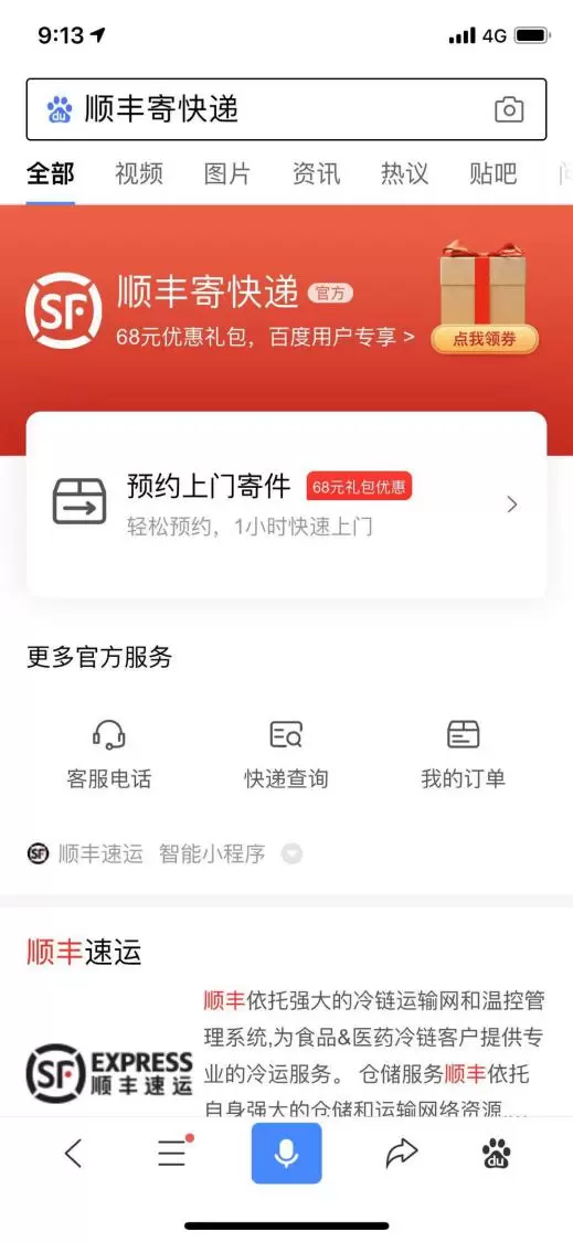 此外,当用户搜索“顺丰快递”、“德邦物流”等物流企业关键词时,还可以通过结果页中的互动卡与寄件卡等直接进入相应的智能小程序,并预约相关人员预约寄件。