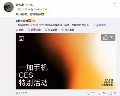 12月13日,一加发出了CES(国际消费类电子产品展览会)2020特别活动邀请函。从邀请函中可以看到,一加将于1月7日至10日间在拉斯维加斯举办一加手机CES特别活动。随后,一加CEO兼创始人刘作虎发微博表示该活动“值得期待”。