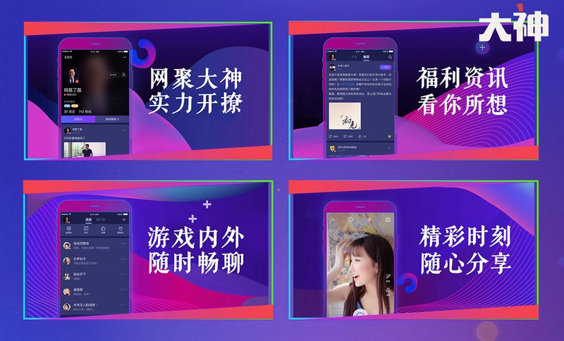 简单说,网易大神就是一个垂直于网易游戏的玩家社区,最终对接网易所有的游戏IP。从发布的产品海报上,可以看到网易大神采用了像微信的即时通讯模式,像微博的图文资讯广场模式。而且在抖音式的短视频如日中天的当下,产品很大可能会带有视频分发功能。