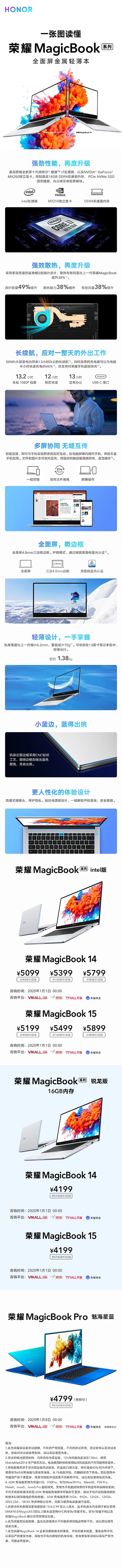 荣耀MagicBook 14锐龙版R5/16GB/512GB售价为4199元,荣耀MagicBook 15锐龙版R5/16GB/512GB售价为4199元;荣耀MagicBook Pro 魅海星蓝配色版R5/16GB/512GB售价为4799元。
