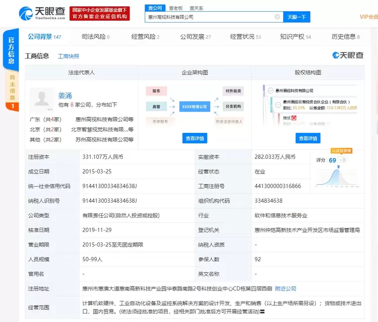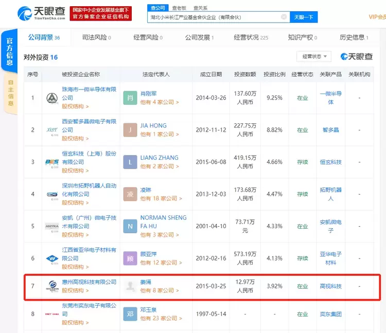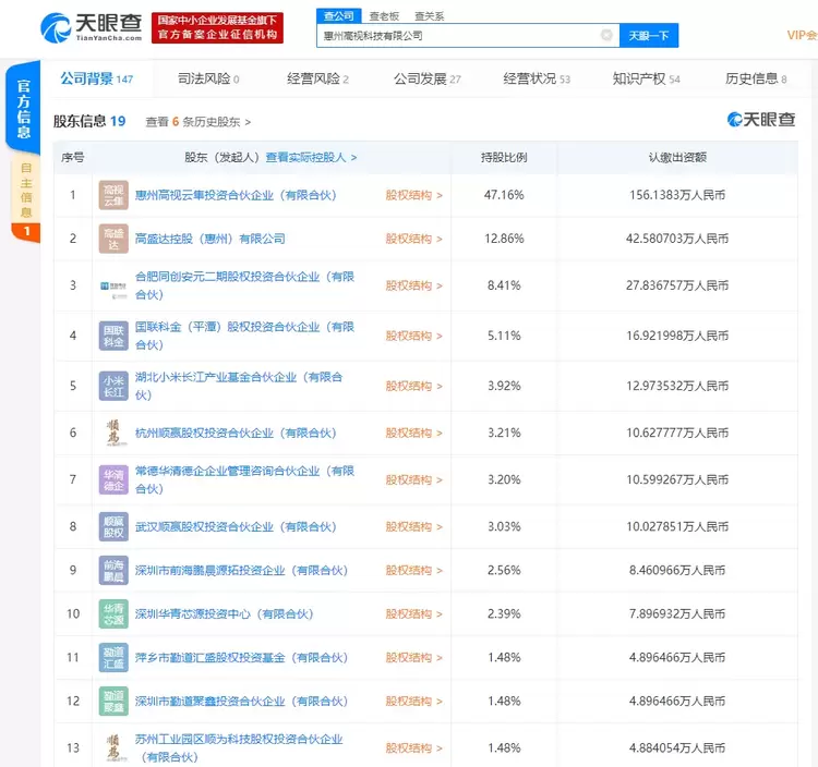 惠州高视科技有限公司成立于2015年3月,注册资本约331万人民币,公司法定代表人为董事长姜涌,公司经营范围包括计算机软硬件、工业自动化设备及监控系统解决方案的设计开发、生产和销售(以上生产场所需另设)等;在公司的股东信息中,湖北小米长江产业基金合伙企业(有限合伙)持有该公司3.92%的股份;顺为资本的投资实体之一杭州顺赢股权投资合伙企业(有限合伙)和苏州工业园区顺为科技股权投资合伙企业(有限合伙)分别持有该公司3.21%和1.48%的股份。