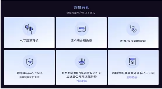 提前全款预订X30系列的用户,可以享受赠送W7蓝牙耳机、半年vivo Care(碎屏宝/延保/后盖宝)、图案/文字镭雕定制、24期分期免息、以旧换新最高300元的额外补贴等福利,优惠力度非常给力。