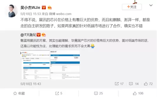 不少媒体在微博纷纷开启新一轮的爆料模式,尤其在配置方面,有媒体就表示此次的魅蓝新机并没有采用时下主流的高通或是MTK的处理器平台,而是选择了较为小众的展讯SOC。作为中国芯最重要的代表公司,此次魅蓝6T或将搭载展讯SC9850四核处理器平台,因为市面上少有同类产品,对于其性能也无法做出详细的判断,但是就其跑分数据来看,魅蓝6T或将作为入门千元机存在,在售价方面或许也不会太高。