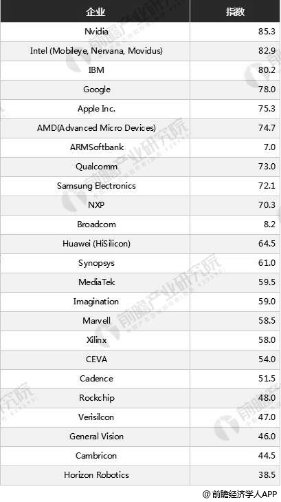 近年来,各类势力均在发力AI芯片,参与者包括传统芯片设计、IT厂商、技术公司、互联网以及初创企业等,产品覆盖了CPU、GPU、FPGA、ASIC等。在市场调研机构Compass Intelligence2018年发布的AIChipset Index TOP24榜单中,前十依然是欧美韩日企业,国内芯片企业如华为海思、联发科、Imagination(2017年被中国资本收购)、寒武纪、地平线机器人等企业进入该榜单,其中华为海思排12位,寒武纪排23位,地平线机器人排24位。