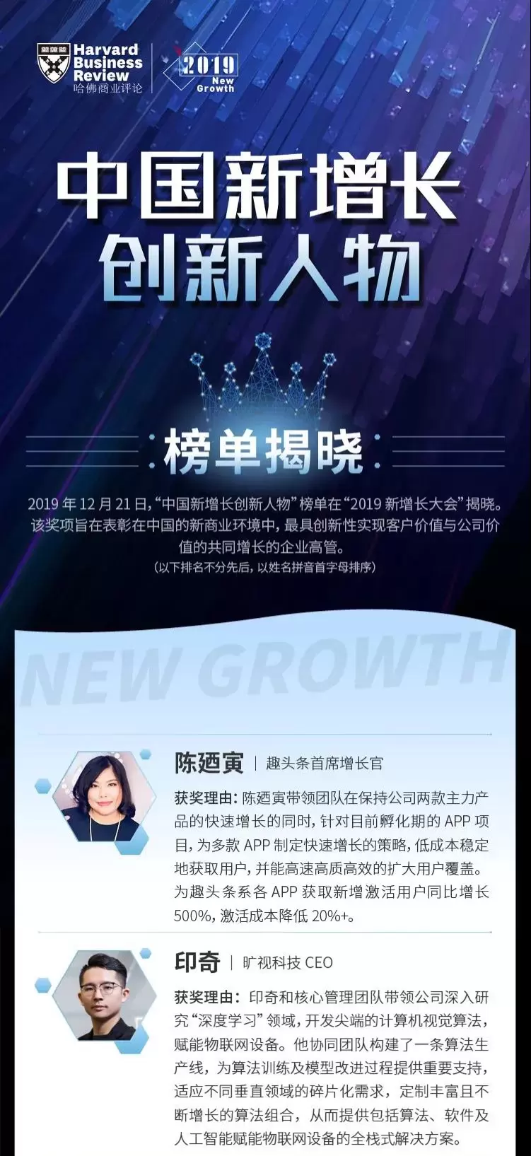 2019年12月21日,由《哈佛商业评论》主办的“2019中国新增长大会”举行。会上公布了“中国新增长创新人物”榜单,旨在表彰在中国新商业环境中,最具创新性实现客户价值与公司价值共同增长的企业高管。其中,旷视联合创始人兼CEO印奇成功入选。