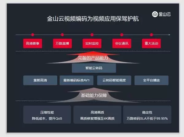 金山云在视频编码行业深耕超过了五年,可以极大地降低视频的传输成本,而且因为视频的码率降低将提升QoS质量和用户体验,低码率还可以保证低失帧度,从而让用户可以享受到4K画质。金山视频云在万路直播方面的SLA不低于99.95%,同时提供集智高清、KAV1和云转码SDK等产品。针对传统编码器做云转码存在的问题,金山视频云利用AI+编码技术为所有的转码场景提供更高的压缩率,特别是低清视频转码提升很明显,所以最大增益的场景还是低清的UGC短视频,这也是目前使用集智高清服务数量最多的用户场景。