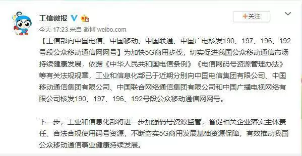 工信部官方微博昨天(24日)透露,工信部近期已向四家获得5G牌照的企业核发190、197、196、192号段公众移动通信网网号。通告全文如下: