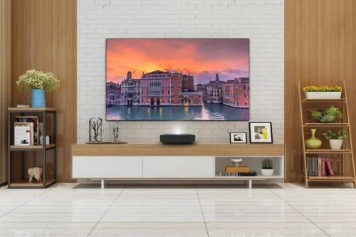 其一,在观看体验方面,激光电视需要配备专业屏幕。《激光投影电视接收机技术规范》中规定,激光电视是采用激光光源,配备专用投影幕,可接收广播电视节目或互联网电视节目的投影显示设备。此外,《激光投影电视接收机用光学屏幕技术规范》中认为激光电视配备的屏幕应当是具有特殊微结构的抗光屏幕。专业激光电视屏幕的意义在于能够对投影机的光线进行反射并保证主要进入人眼,而对环境光线进行反射或吸收后只允许很少部分进入人眼,以保证最佳的图像对比度。例如,海信激光电视专门配备的菲涅尔无源仿生屏,既可以做到超强抗光,又可以达到更柔和护眼的显示效果。相较而言,投影设备直接将画面投至墙上等,由于难以屏蔽环境光,也就难以享受4K等高画质体验。