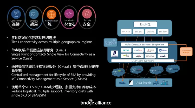 桥联盟(BridgeAlliance)物联网副总监林明良指出:“Bridge Alliance是由亚太、中东和非洲地区的34家知名移动网络运营商(MNO)组成的合作伙伴联盟,拥有超过8亿用户。Bridge Alliance可以通过提供物联网连接管理服务( CMaaS )集中管理 SIM 的生命周期,此外,使用单个 SKU SIM / eSIM 减少后勤、多重支持和库存成本。”