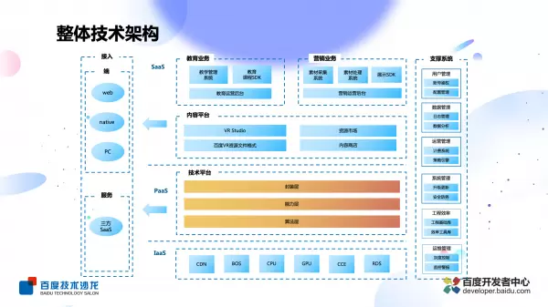 百度VR在整体技术架构,设计了高度分层、业务解耦的技术框架,搭建了PaaS化的技术平台和SaaS化的业务层。横向上可以很好地支撑业务的扩展,纵向上可以有效支持Pass层的通用技术能力输出和SaaS化的业务解决方案输出。