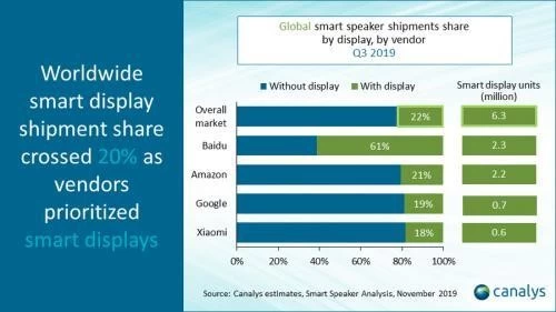 根据IDC发布的2019上半年智能音箱行业报告显示,2019年上半年,百度旗下小度在家智能屏出货量超368万,超过了排名其后四位品牌出货量的总和,远远领先国内外竞品,位列全球第一;Strategy Analytics数据也表明,2019年小度在家智能屏前三个季度出货量占全球第一,远超亚马逊、谷歌,占据绝对优势。