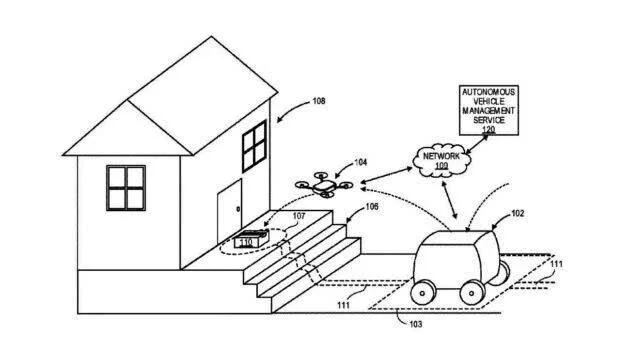在这份专利申请中,亚马逊发明家希利亚德·布鲁斯·西格尔(Hilliard Bruce Siegel)和伊桑·埃文斯(Ethan Evans)描述了一种系统,该系统可以让自动驾驶地面车辆将包裹运送到客户所在的社区,甚至可能是客户门前的街道上,并用无人机协调到门口的递送。