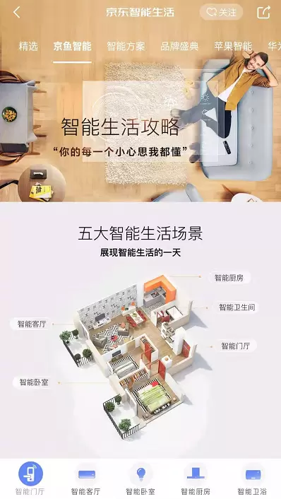 频道以京鱼座智能生态为核心,同时引入苹果HomeKit、华为智选、海尔智家、美的智能、云米智能等其它生态品牌。