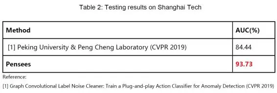 经过测试,澎思科技提出的异常行为检测算法在UCF-Crime数据集(Table 1)和Shanghai Tech数据集(Table 2) 大幅领先SOTA算法,刷新了世界记录。