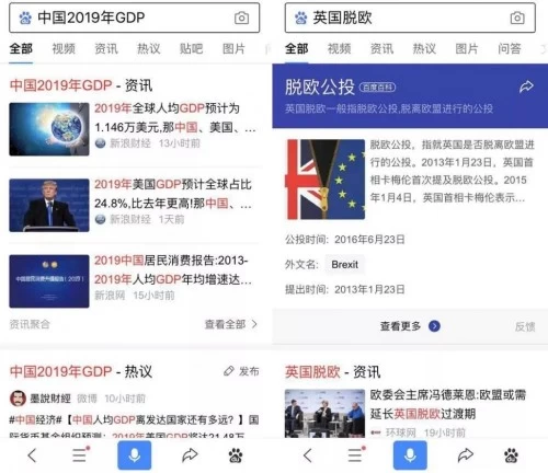以搜索“中国2019年GDP为例”,首页只有第三条是百度“国内生产总值”的词条,第一条依然为“最新相关信息”资讯聚合,第二条为“热议”产品,其他主要新浪财经、东方财富网等财经信息。