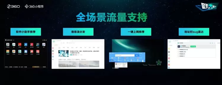 所谓360小程序就是基于全场景互联网的全新开放模式,以全方位技术、资金支持,帮助企业无门槛接入,轻松打造PC+移动跨屏产品阵地,覆盖用户使用全场景,共享以360浏览器、安全卫士、搜索和导航等产品为基础的平台百亿流量价值和5亿白领人群。