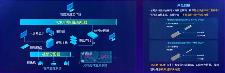 周界安防监测系统是长飞公司将光纤特性进行更深层次延伸与开发的成果,基于特种光纤的多模散射特性,结合分布式光纤传感系统,采用多维度信号编码及高精度解调功能,提升安防监测的及时性和准确度。且此系统具备标准化的接口,可与多厂家的摄像头和视频监控系统联动,将园区的整个安全管理进行有机的融合,真正做到安防无死角,同时大幅降低安保人员工作强度。