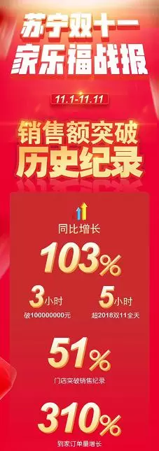 刚刚完成股权交割第二天,200多家苏宁易购电器店即完成入驻全国家乐福,同天开业,当日客流就超过10万人次。紧接着,在10月21日的苏宁双十一发布会上,家乐福宣布正式以“1小时场景生活圈”新成员的身份,首次参战双十一。数据显示,仅11月1日,家乐福就刷新了3小时销售破亿的新纪录,整个双十一期间,家乐福销售额同比增长达103%,到家服务订单量增长310%。