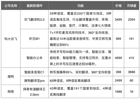 表2-1:科大讯飞部分智能硬件及其竞品介绍