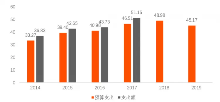 图2-9:2014年-2019年公安部和司法部科学技术预算支出及支出额(单位:亿元)