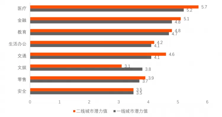 同时,在人工智能细分场景的潜力值方面,医疗、教育在一、二线城市中潜力值排名位居前三,人工智能技术目前在医疗、教育市场的应用还未能满足城市居民诉求,还有很大的发展空间。
