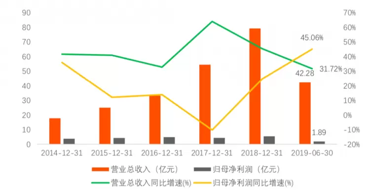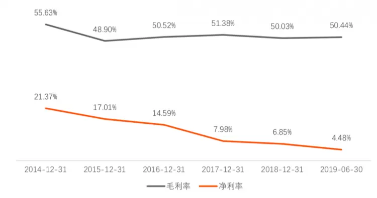 从营收和归母净利润来看,近年来,科大讯飞营收一直保持高速增长,归母净利润在2017年后实现增速的触底反弹,开始快速增长。2019年上半年,科大讯飞实现营收42.28亿元,同比增长31.72%,营收增速下降,这与科大讯飞的战略聚焦策略以及宏观经济带来的经营压力有关;实现归母净利润1.89亿元,同比增长45.06%,由于科大讯飞营收还处于快速增长阶段,而费用端增长得到控制,因此归母净利润实现快速增长。